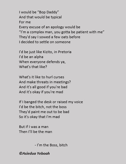 It’s so tedious and tiring running as fast as possible, second guessing every decision over and over, To belong. To make the stares and queries stop. The double standards, the snide comments, and sabotage. “But, honey, I’m not bossy. I’m the BOSS.” continues to sip wine